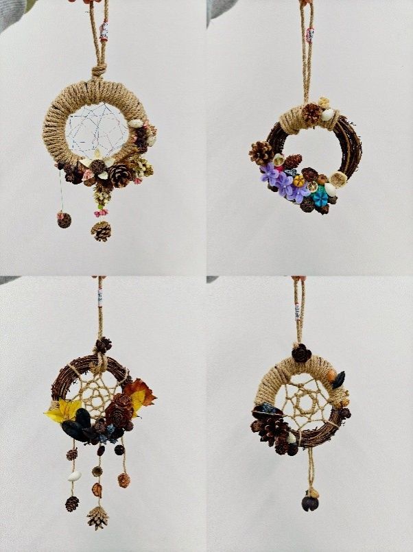 本次活动以“手工赋能文化传承”为核心,参与者利用彩色麻绳、剪刀、胶水及松果、薄荷、桂花、陈皮等干制中药材,在现场沉浸式完成创作。同学们先编织麻绳框架,再根据中药特性剪裁搭配,将药材与干花、串珠等配件巧妙粘贴,让每一件挂件兼具实用性与文化感。其中,张怡晗、周宇晴、赵溢馨团队的作品荣获一等奖,该作品视觉上以麻绳圆环与捕梦网结构形成规整又灵动的层次感,干花、松果与药材色彩自然呼应,质朴中透着灵动,传递与自然相融的养生理念。
