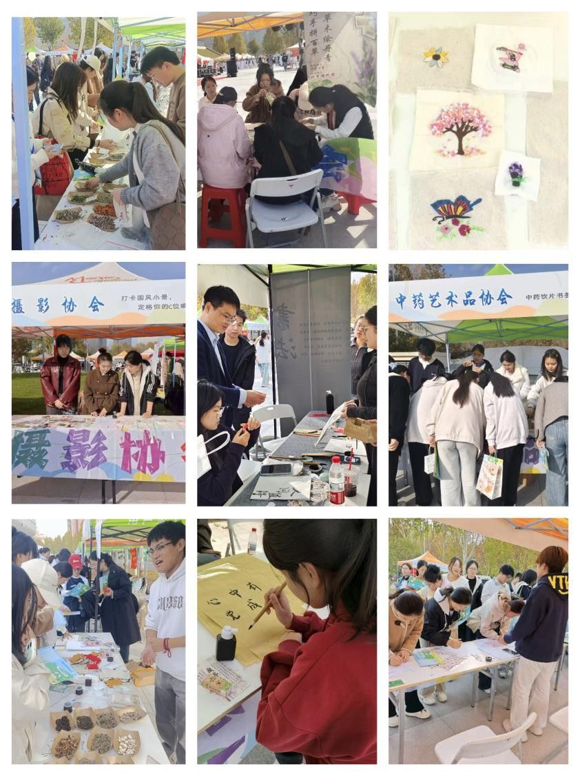 金秋送爽,丹桂飘香,校园百团大战招新活动如期而至。各大社团各展所长,以特色活动为媒,搭建起文化传承与兴趣交流的桥梁,吸引了众多学子踊跃参与,现场热烈非凡。Sunny Talk英语口语社的“English Fun Battle”中英双语协作比拼活动,聚焦中医药术语解读,让学生在趣味竞技中同步提升口语表达与专业知识储备。中医药养生协会让学生以中药植物为原料拼搭艺术画作,近距离触摸中药植物的原生形态,直观感受传统药材的自然之美。远志医药文学社举办的香囊手作活动氤氲自然药香,让传统医药文化在药香中深入人心。中药艺术品协会的百草书签制作工坊,将河南道地药材封存于晶莹滴胶,定格原生肌理与天然药香,成就天然质感与匠心工艺的完美融合。远志讲解团举办中药灯谜活动,将中药知识藏于谜面,在古韵巧思中加深学生对传统医药的认知。开心剧团精心组织戏剧剧本创编活动,鼓励学生发挥脑洞、释放创意,让青春视角与多元创新通过剧本具象化。党章研习社举办的“墨韵传承”主题活动,展映经典书画作品,深度解读传统文化内涵,筑牢文化自信根基。大学生书画协会以节气灯谜串联时节智慧,用书签书写传递笔墨韵味,让诗韵与书法之美在互动中自然流淌。七色光志愿者团队以针线为媒,将志愿温情与传统刺绣工艺相融,用细腻针脚勾勒美好意象,让传统技艺在青春实践中焕发新生,让爱心与匠心双向传递。职业生涯规划发展协会通过举办干花杯垫创作活动,让学生以手作定格干花雅致,用创意诠释初心与理想,书写职业规划宣言。摄影协会举办国风背景打卡活动,以镜头定格传统韵味,通过自拍打卡留存美好回忆。