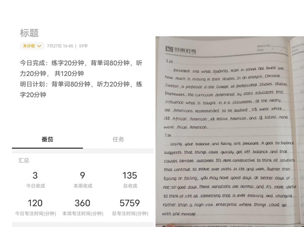 本次活动采用线上打卡的形式,共有46人参与,参与活动的同学通过制定合理的学习计划,借助软件记录学习时长,在群相册提交当天学习笔记照片、学习时长截图等完成活动任务。活动中,同学们都热情高涨,互相比拼,积极完成学习任务,争做学习标兵。其中王影、王梦杰等同学积极完成每日打卡目标,为同学们树立了良好的榜样,营造了良好的学习氛围。活动结束后,同学们纷纷表示自己的学习和生活更加有计划性,自律自觉能力显著提高,收获颇丰。