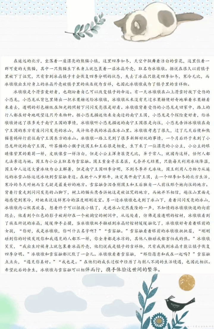 本次活动以“童话”为主题,要求同学们结合自己的生活经验进行想象、联想或者利用“续编”、“改编”原有的童话故事内容。活动开展后,同学们积极参加本次活动,大胆的发挥想象,在充满童趣的诗歌实践创作中找寻着曾经的童趣,表达对自我的探寻,以及对生活美好的体味,营造了踊跃的活动氛围。其中,2022级中医学本科三班辛阿媚同学创作的《冰墩墩和雪容融的故事》围绕冰墩墩和雪容融两个人物,以追求“真、善、美”为主题,抒发了他们对美好世界的憧憬和向往,表达了两人之间真挚的感情,被评为一等奖作品。