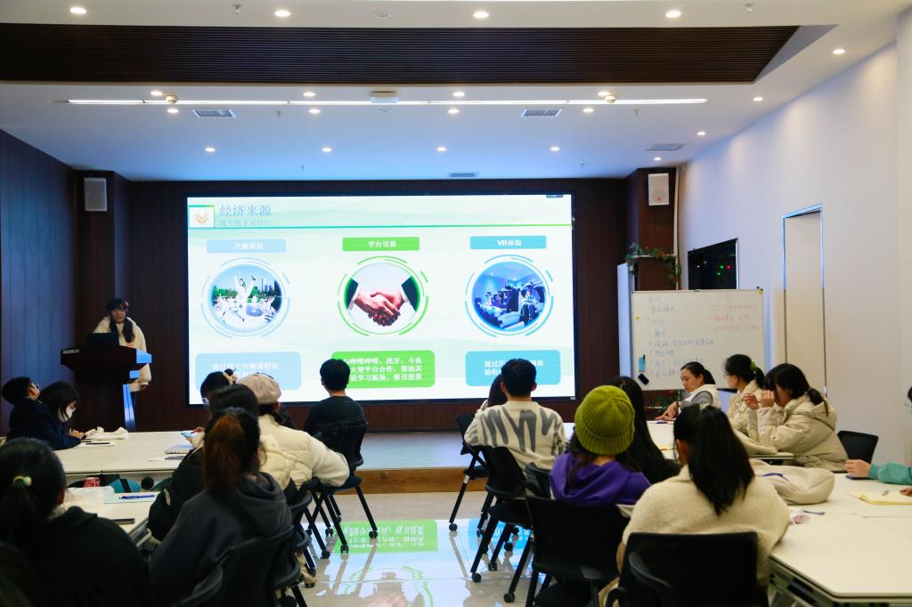 在分享会上, “沉浸式中医药文化体验馆”、“知行教育—双轨并行开辟融合育人新模式”等六个项目小组的汇报人依次上台进行展示与汇报。项目准备前期,项目成员之间在不断的头脑风暴中,激发了创新性思维,迸发出灵感的火花;在两周的项目打磨过程中,队员们积极调研、分析市场容量、对标客户群体、创新运行模式,最终在分享会上进行了全面的展示。会上,胡春月针对每组的优缺点进行了详细分析,并对各个项目提出了个性化建议;引导同学们在项目打磨过程中,要查漏补缺,抓住核心要义,以评委的眼光审视项目的优劣势;