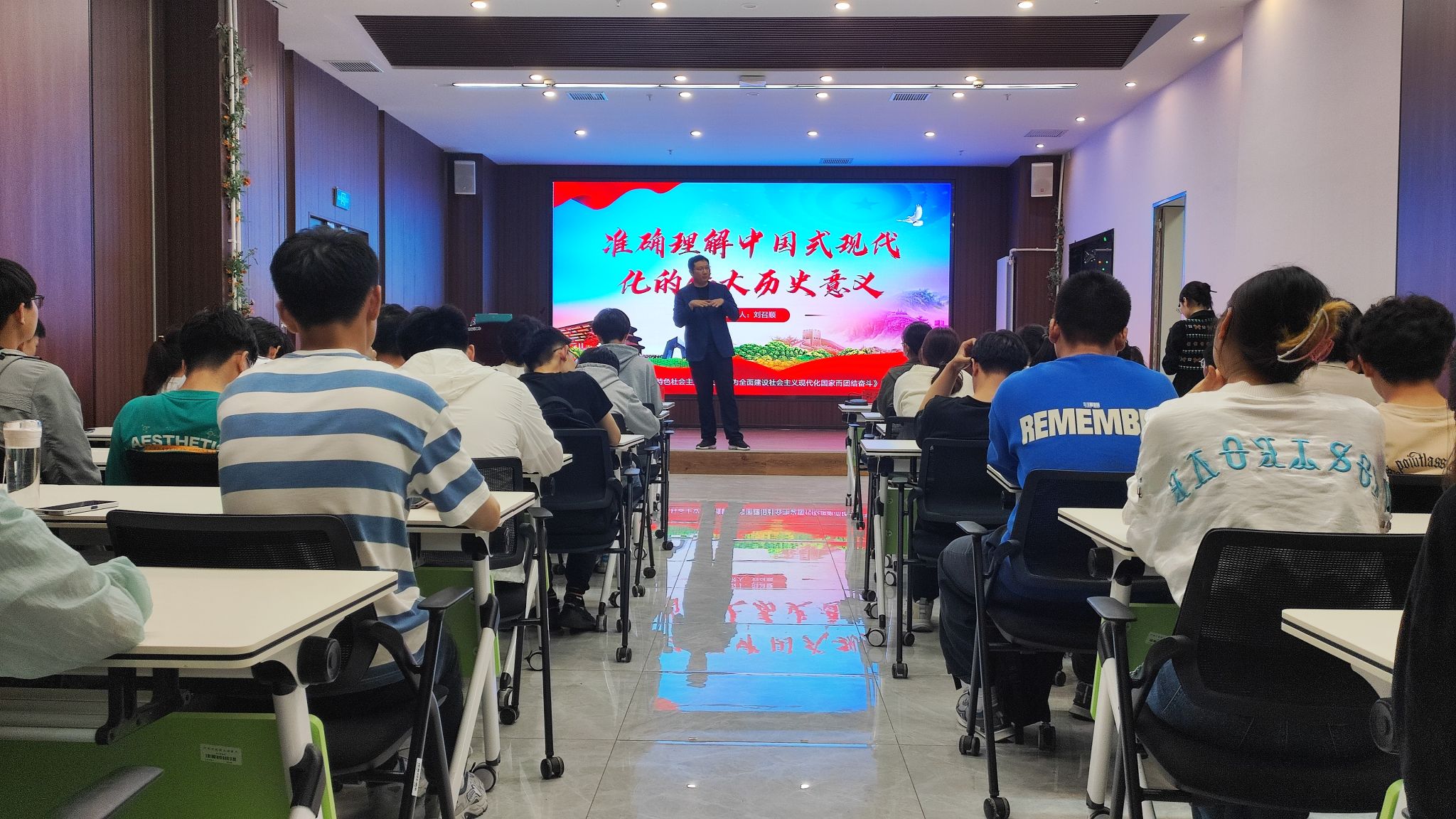 刘召顺老师首先带领同学们从实践基础、思想引领、使命任务、部署工作和加强领导等五个方面向同学们讲解了党的二十大报告的主题内容和深刻含义。接着,刘老师从身边实例和各类数字材料出发,以小见大的为同学们讲解中国式现代化和西方国家现代化之间的区别,并鼓励同学们读原著、学原文、悟原理,学深读懂悟透,在践行中做到知行合一。随后,刘老师通过讲解中国共产党百年征程中重大历史事件进一步坚定了大家爱党敬党、永远跟党走的信念,鼓舞同学们要肩负起当代青年的时代责任,在青春赛道上展现自己的风采。