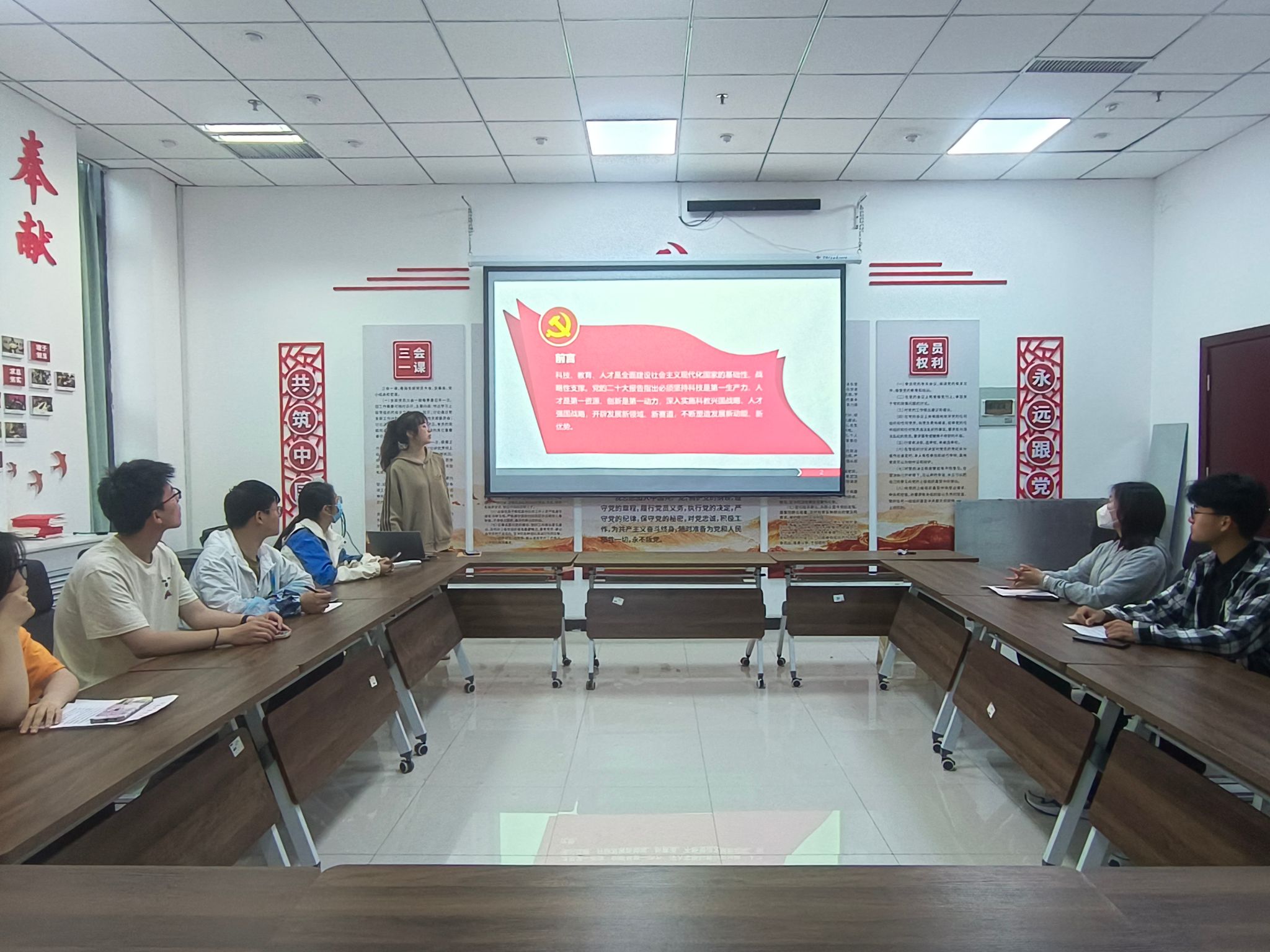学子共同学习研讨党的二十大精神。宣讲团成员柴留路以“凝聚奋进力量,勇担时代使命”为主题,从身边小事切入,并指出我们作为新时代中医药文化的传承人,要勇做走在时代前列的奋进者、开拓者、奉献者,在钻研专业知识的同时积极研学党的二十大报告,让青春在全面建设社会主义现代化国家的火热实践中绽放绚丽之花。宣讲结束后,同学们纷纷发表见解,互相交流关于党的二十大报告的学习心得。