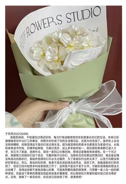 本次活动以“花开五月天,感恩母亲节”为主题,参与人员用心撰写最想对母亲说的话,诚挚地表达对母亲的感恩之情,收集到24份温暖的作品。此次活动中收集到许多充满爱意的优秀作品,同学们有的通过鲜花表达感恩,有的通过微信直接送上节日祝福,有的制作贺卡来表达自己的感激之情……其中,22级中药学类五班的于贺燕同学精心为母亲准备一束鲜花并且在感谢信中表达出希望母亲一切安好的心愿,真诚感人。参与活动的同学也纷纷表示此次活动让自己重温了成长历程,更加深入的了解母亲的那份无私的爱,也借此机会向母亲表示感谢。