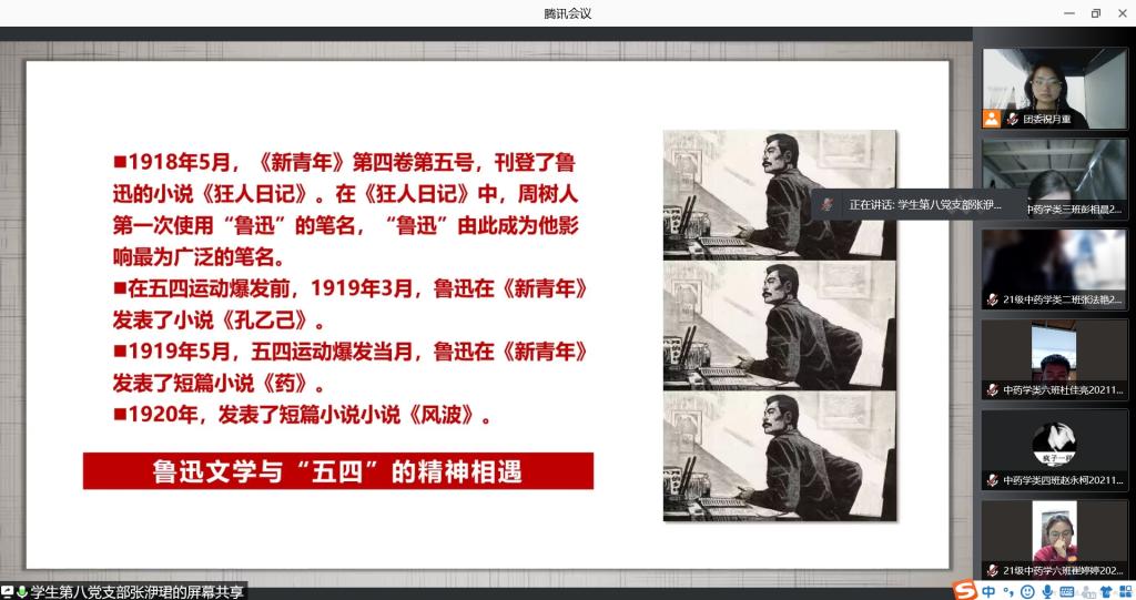 学生第八党支部成员张洢珺带领大家学习红色诗词《自题小像》,通过观看相关视频,从多个方面了解了鲁迅先生的生平事迹和人格魅力,感悟先辈们在“五四运动”中展示的伟大抗争精神,体会先辈们甘为炬火的执着坚定。在分享交流环节,同学们积极踊跃,主动地交流自己的感悟,共青团员徐一淇说:“革命先辈们燃烧自己换就中国的现在,我们也当竭尽全力守护今日的中国,我们一起共勉!”