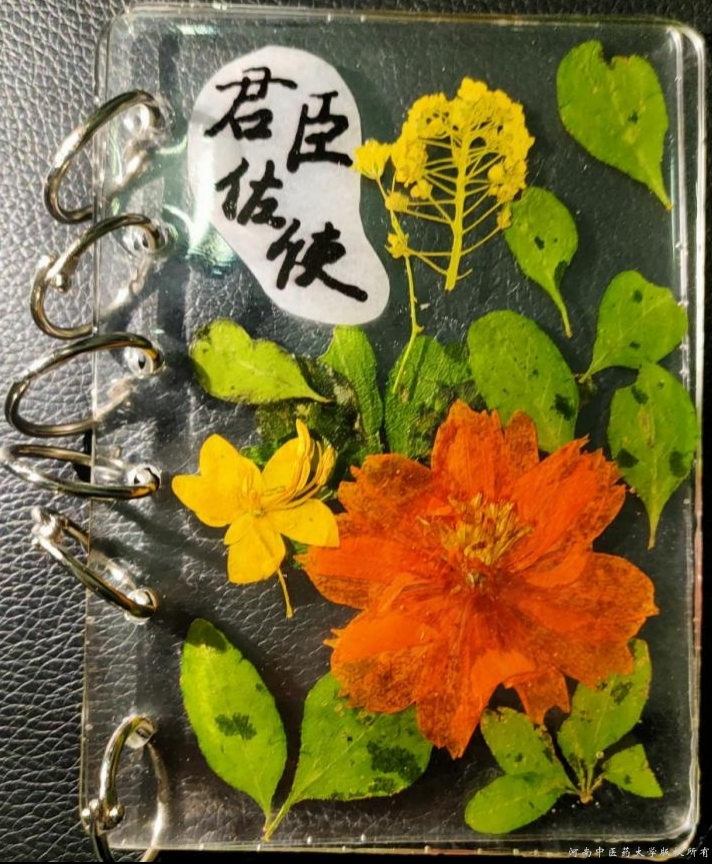 本次活动以“传承中医文化,锻造文创精品”为主题,将流行元素、创意产品与中医药哲学思想、文化内涵、养生理念相结合,通过工艺品类、生活用品类、办公用品类等类型进行展示,让中医药文创产品融入到人们的日常生活之中。其中最为优秀的当属2020级药物制剂本科班冯一帆同学一组的滴胶本作品《君臣佐使》,作品采用牡丹、地黄、枸杞的叶子和菊花的花朵等中药作为线圈本的主体部分,配以鲜明的主题“君臣佐使”——用于主治的称君,辅治的称臣,相反而相助的称佐,引导及调和的称使,进一步引发同学们对中医配制药方方法的学习和反思。