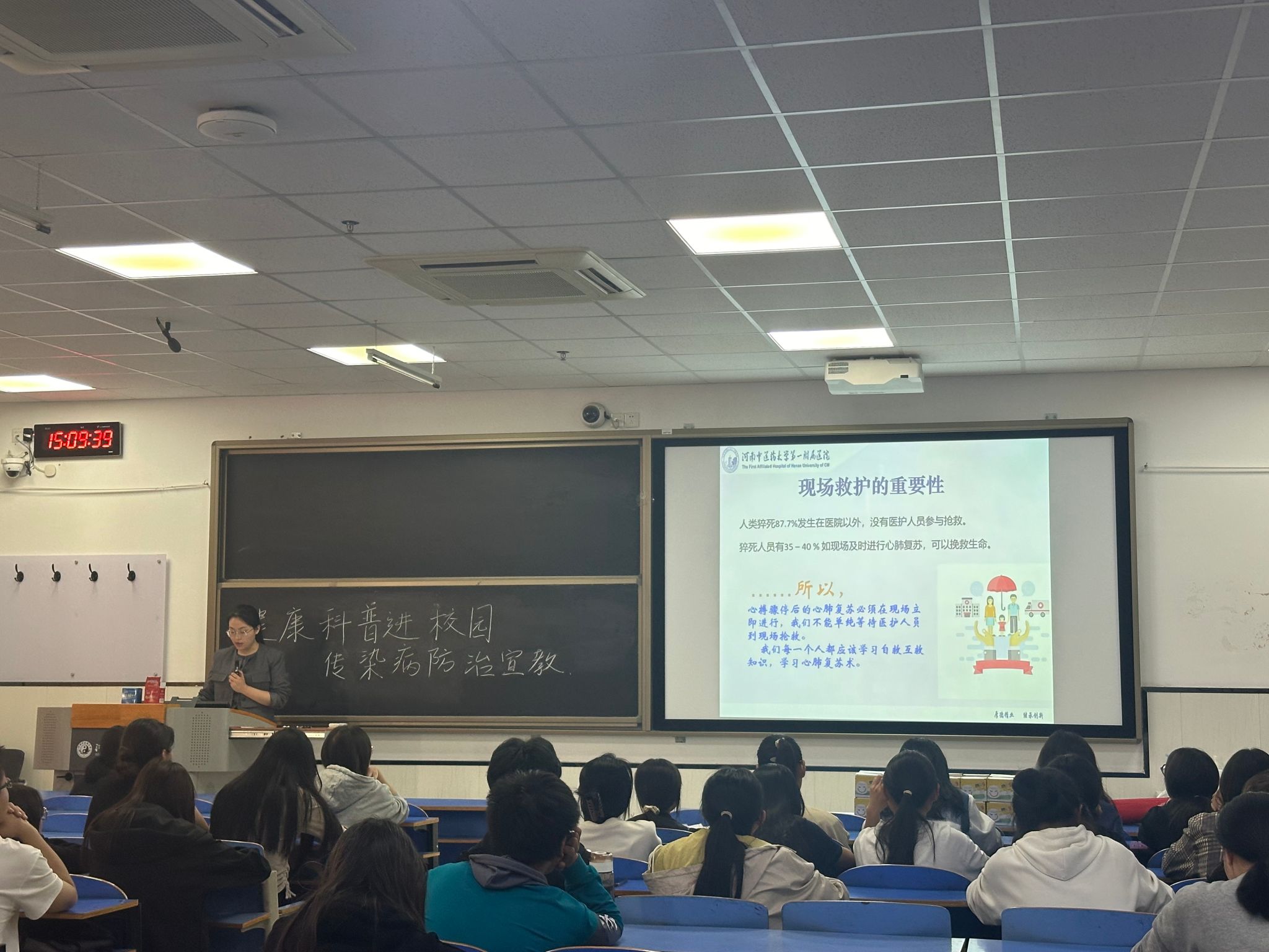 活动中,主讲老师从紧急救护知识、保健常识等方面进行讲解,列举了大量的生活实例。现场实操演示心肺复苏、海姆立克法的科学急救方法,强调了心肺按压、人工呼吸等正确操作方式,对大学生医保政策、传染病防治等健康知识进行了普及。同学们在活动中认真听讲,收获颇丰。宣讲活动结合有奖竞答方式,充分调动了学生的学习兴趣,同学们举手抢答,现场气氛热烈。