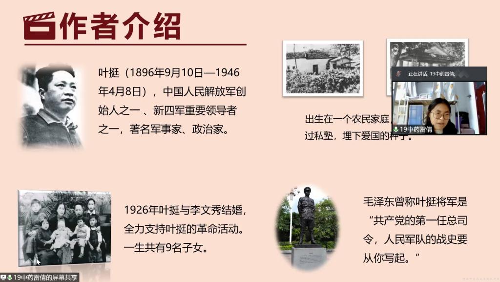 活动伊始,学生第一党支部成员雷倩作为领学人带领同学们了解了叶挺将军的事迹,通过观看《囚歌》的相关资料和影音,引领同学们体会叶挺将军通过《囚歌》所传达的百折不挠的革命精神。在分享交流环节,同学们积极踊跃,纷纷发表感想,共青团员王思懿说:“革命先辈们用血和泪写就历史,我们身为他们的接班人,应不负历史不辱使命。”