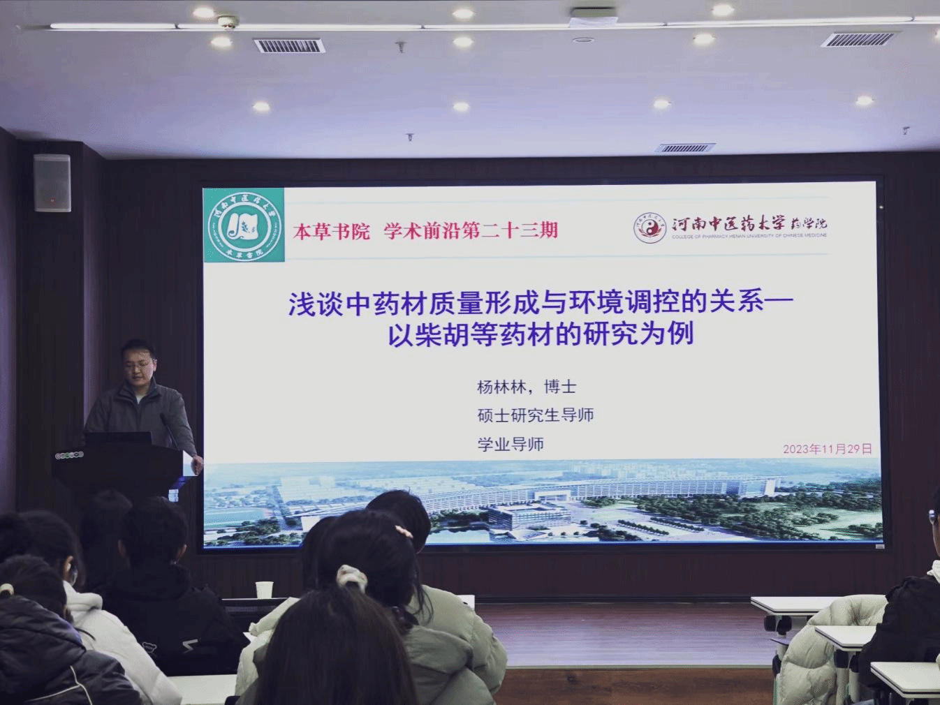 朋辈导师于2023年11月29日在远志学堂举办“浅谈中药材质量形成与环境调控的关系”第23期学术前沿活动。本次活动邀请学业导师杨林林主讲。