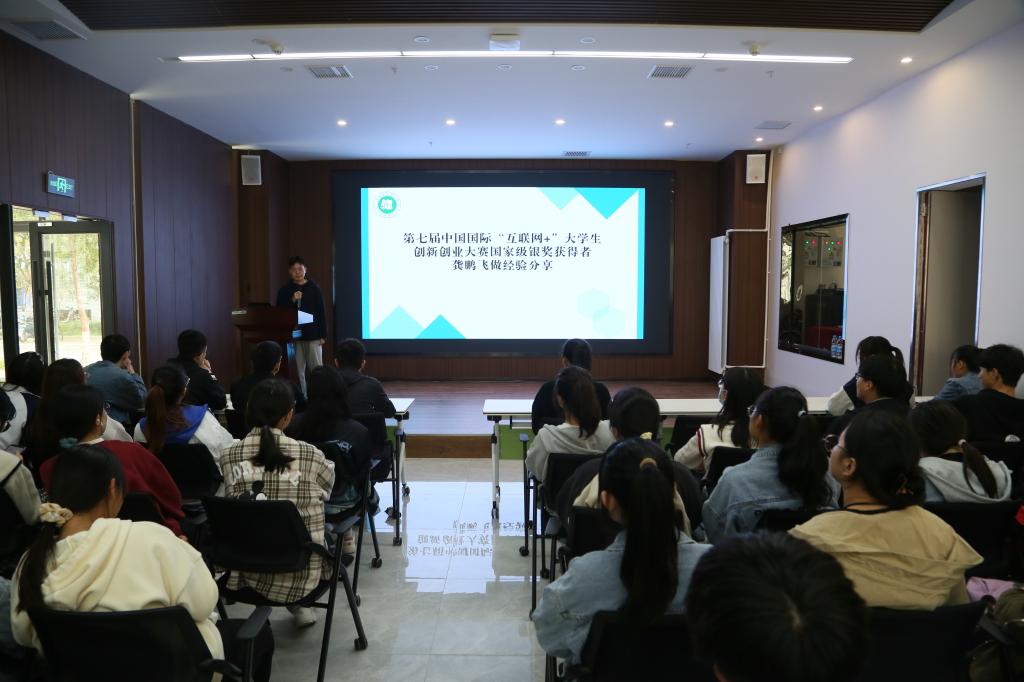 将竭尽所能的为同学参赛提供便利条件,做好各项服务和指导工作。随后,第七届中国国际“互联网+”大学生创新创业大赛国家银奖项目负责人龚鹏飞同学以自已的实践项目为例进行了经验分享,从选择团队、知识储备、赛时准备多个方面,鼓励学弟学妹提高主动性,将努力付诸于实践,积极参与到创新创业中,在大学期间不断去积累丰富自己。动员会上同学们热情高涨,互动积极,纷纷表示获益匪浅。