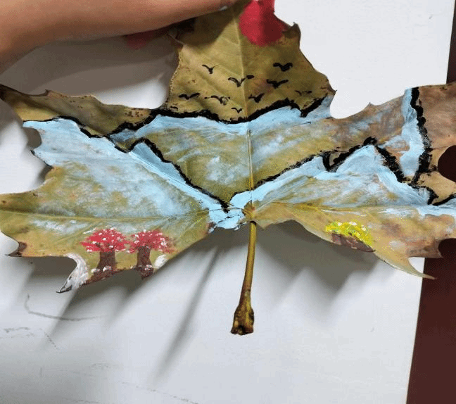 本次活动以树叶代替画纸的形式开展,活动的有趣形式赢得同学们积极踊跃的参加,活动共计收到32份作品。活动过程中,同学们在树叶上用颜料绘制出精美的图案,有的画溪流,有的画山川,还有的画星辰大海,也有的以叶为纸写下饱含深情的诗歌,参与同学充分发挥自己的想象力和创造力,展开了艺术创作。其中,2023级中药学类四班肖尧同学的作品诗画双绝,意蕴悠远,与本次主题完美契合,从众多作品中脱颖而出,荣获一等奖。