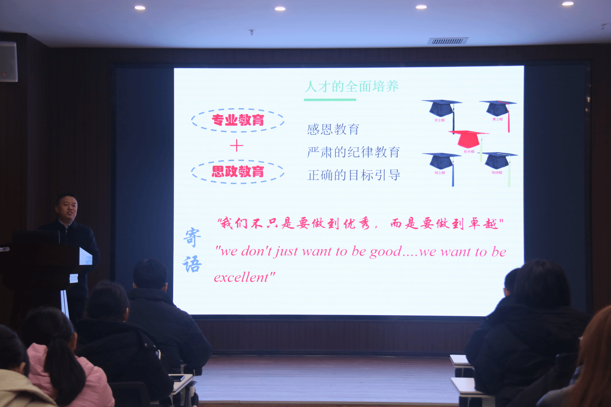 大学教育期间,专业知识只是其中教育的一部分,并不是全部,为帮助同学们了解更多行业发展现状,打破信息茧房,李朋伟教授通过真实事例讲述中药智能制造的发展意义,从“十四五”时期后,高校、企业和教指委所做出的努力,使同学们清醒地认识到中医药信息化发展不平衡、不协调、不深入等问题还比较突出,与数字中国、中医药传承创新发展、全民健康信息化要求存在较大差距。李朋伟同时提醒同学们要注重多学科的交叉学习,培养主观能动性,注重感恩教育和纪律教育,有正确的目标引导,做到专业教育和思政教育相结合的全面发展,鼓励同学们将个人成长和国家发展相联系,树立远大理想,为建设中药智能化出一份力。