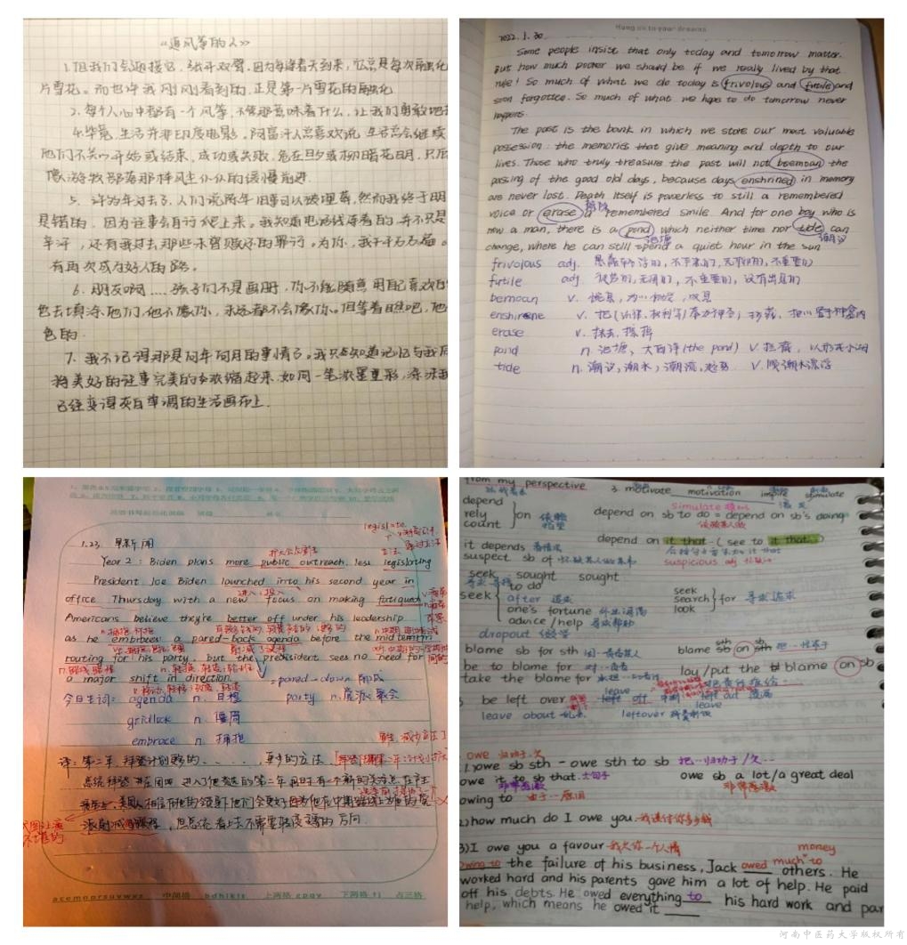 针对学生们的不同侧重情况,积极开展英语打卡和读书笔记打卡两个活动项目,同学们每天以图片的形式上传并展示自己的学习成果。活动期间,同学们积极参与,按时按量完成打卡并附上自己学习后的理解与思考。其中,2021级中药学类五班周月月同学用工整有力、干净整洁的文字写下了读书后自己的深邃思考,并将优美深刻的句子进行摘抄。同学们将学习的激情融于笔尖,一笔一画诉说着自我意志的磨练,随着学习习惯的养成,学习过程中的逐步积累,其理解与思考也逐渐深入,使得本次活动发挥了其应有的作用。