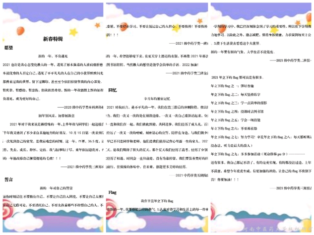 此次“旧年别风采,初春展新意”活动受到了大家热情响应。活动一经发布,同学们便通过QQ空间等形式积极宣传,大家积极参与,将自己辛丑年的目标及独家记忆分享出来,积极交流,感慨自己一年里的的所学、所感、所悟。其中,2021级中药学类五班陶思雨同学书写对自己高考奋斗史的感慨,“仿佛一朵姹紫嫣红的奋斗之花,孕育了三年,只为那一瞬间”,勉励自己在新的一年里踏上新的征程。2020级中药学类本科班孙静怡同学则书写下对自己的期待,“愿卓才华艺相为伍,好运机遇竟追逐”。大家积极将自己的思绪跃然于纸上,字句灼灼递新意,让本次活动收到了许多文笔优美的作品,获得了圆满成功。