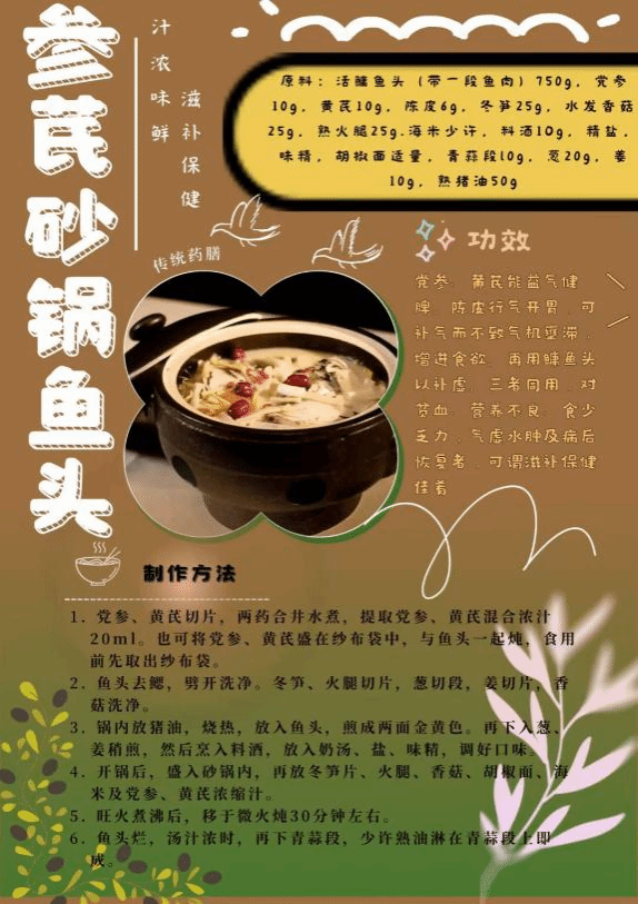 活动期间,同学们积极在活动群中展示自己曾经享用过的美味药膳的图片。同学们用镜头捕捉药膳品相,配以文字描述其功效、制作方法等,并通过海报或文档的形式来呈现。作品中将药膳的美味定格于照片,辅以文字叙述,展现了自己眼中独特的药膳美食。其中,2023级吴曼杰的作品《参芪砂锅鱼头》开门见山,以醒目的“参芪砂锅鱼头”介绍了药膳的名称,随后用“汁浓味鲜,滋补保健”简略的说明了药膳的味道和功效,并辅以照片令人神往。最后,描述了药膳的功效、制作材料和方法,详略得当,引人遐想的同时又激起了观者动手制作的想法。