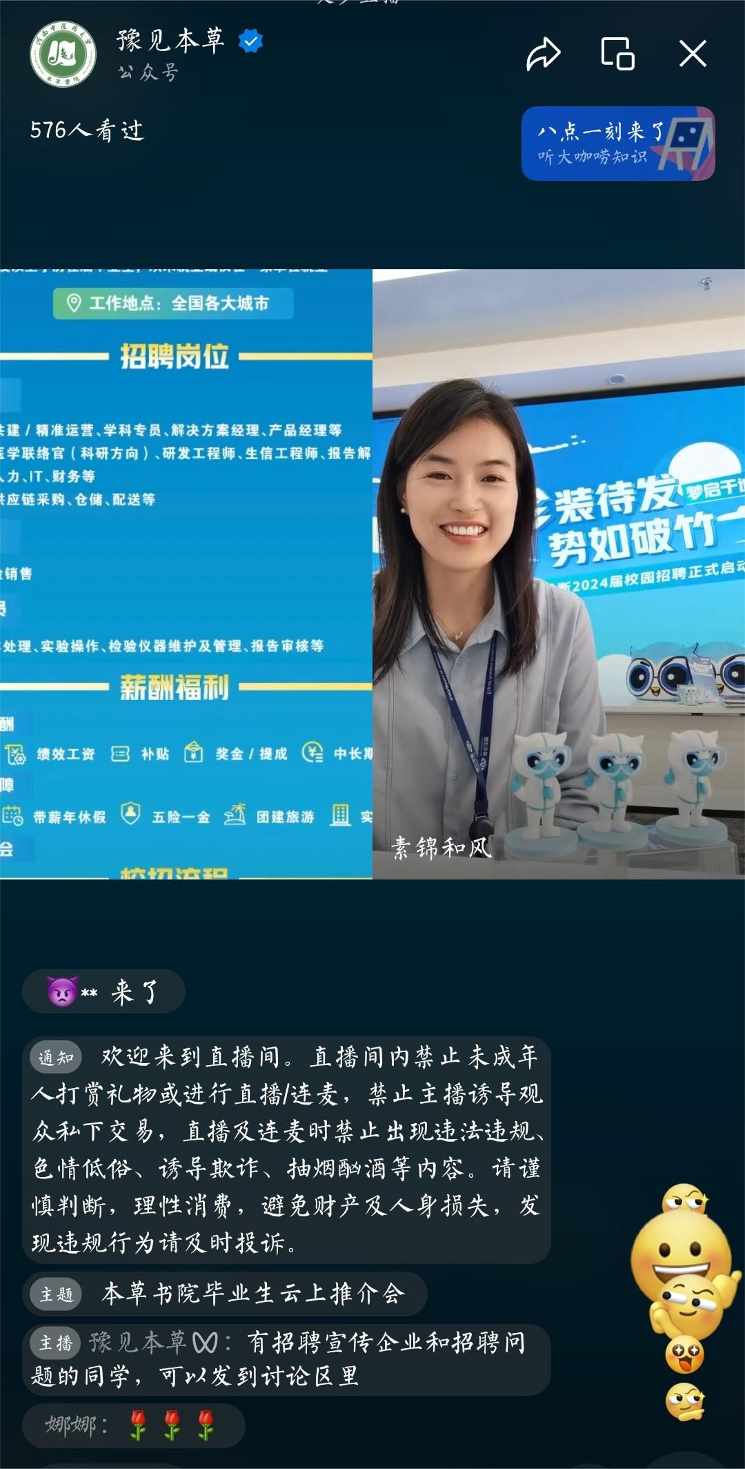 毕业生情况和优秀毕业生代表,南京圣和药业等4家企业代表在线招聘宣讲。有意向求职的毕业生通过和主播互动了解自己感兴趣的企业,借助直播窗口与企业HR进行互动。通过新葡京娱乐城官网