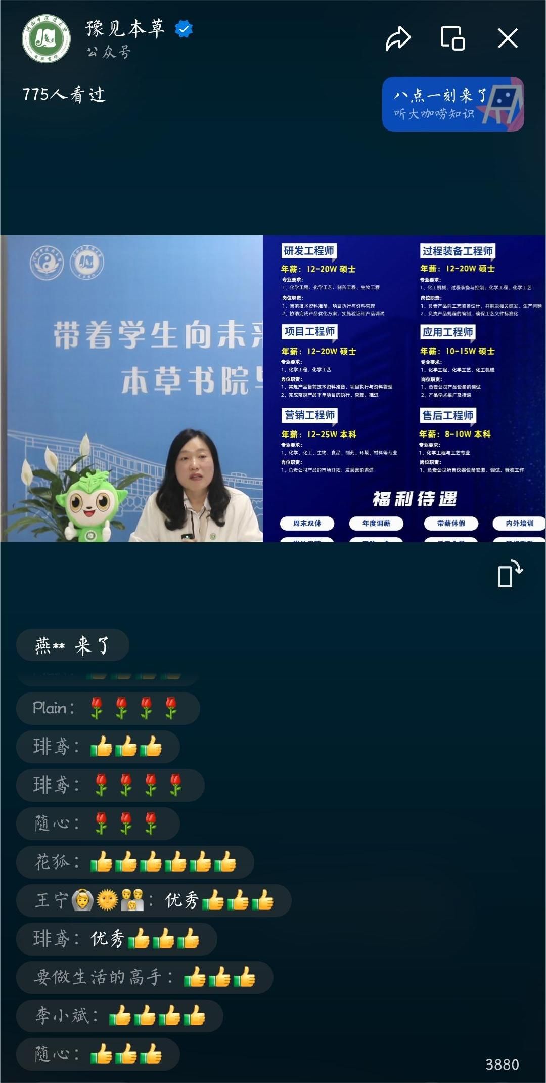 “我曾担任过宣传委员、学生会干事,学生干部经历锻炼了我的策划组织能力和交流沟通能力;在大二参加了大学生创新创业训练活动,巩固了理论知识,培养了严谨细心的做事态度。” 2020级制药工程本科班李萧娴在直播间这样介绍自己,全面展示了个人大学期间所取得的荣誉成绩以及优势特长。“王紫红同学现在在中药分析实验室进行甾体化合物成分研究,实习经历比较丰富,学业态度踏实,表达能力突出,性格积极向上,与同学相处融洽,人际交往能力很强,相信是很多单位所寻找的人才。”2024级毕业生辅导员朱会宇和姚湘分别在直播间倾力推荐各自的优秀学生,直播间里热闹非凡。