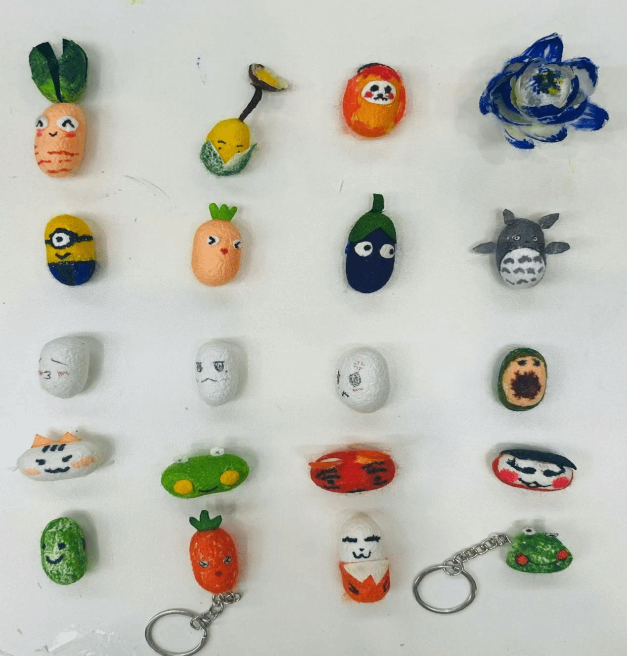 活动开始,工作人员已准备好纯色蚕茧、胶水、剪刀、马克笔以及羊角钉等活动所需材料。从开始用铅笔的构图,再到图案的拼接及上色,同学们用极强的动手能力和丰富的想象力让单调无味的蚕茧迸发出新的生命力。有小巧可爱的大小萝卜、惟妙惟肖的小黄人、更有令人馋涎欲滴的饭团,每一个别具一格的作品都是同学们内心美好品质和心理的映射,创作的过程更是让同学们暂时忘却烦恼,直面内心、认识自己、舒缓心情。