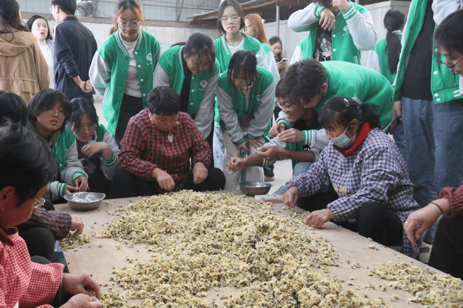 一行人首先来到武陟济华菊花种植基地。基地菊花竞相绽放,清香四溢,在武陟济华怀药种植基地负责人李克松的详细讲解下,同学们亲身体验了采摘菊花,了解了菊花的品种分类、采摘时机对药效的影响以及在清肝明目等方面的广泛应用。接着,李克松讲解了菊花烘干所需的适宜温度以及步骤,同学们了解了如何控制温度、湿度等关键因素,以确保菊花的药用成分得以最大程度地保留。随后,李克松挖出牛膝和地黄,向同学们展示在怀庆大地孕育出的珍贵中药材,细致地讲述它们的药用部位、特点、生长环境和功效。最后,同学们还品尝了菊花茶和熟地黄,在清香与醇厚间感受传统草药的独特韵味,对中医药文化的奇妙之处有了更直观的体验。