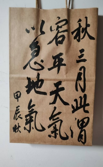 活动巧妙融合了中药的博大精深与秋日的悠悠韵味,鼓励同学们发挥无限创意,将书法艺术的精髓镌刻于质朴的牛皮纸袋上,从而呈现出一系列富有传统文化韵味的佳作。活动现场,同学们纷纷拿起画笔,在一张张牛皮纸上挥洒自如,将内心的诗意与情感化为笔下流动的墨韵。在他们的创作下,楷书刚劲有力,行书行云流水,这些纸袋仿佛被赋予了新的生命,焕发出别样的生机。其中值得一提的是,2022级中医学仲景二班的方浩榕同学选用《黄帝内经》中的经典名句“秋三月,此谓容平。”来进行创作。笔画形态丰富多变,既有圆润饱满、含蓄内敛,也有干净利落、锋芒毕露。笔画之间像是被无形的丝线串联起来,笔锋转换自然流畅,几乎没有明显的停顿,如行云流水一般,体现出一种一气呵成的韵律感。在结构方面,字的重心平稳,疏密变化有度,字的前后相互呼应,形成一种和谐的美感。2023级医学实验技术班邵智晗同学的作品笔画形态精准,行笔平稳,撇如犀角,捺如长刀,笔立轻重恰到好处。在结构方面,重心稳定,比例协调,给人一种稳重的视觉效果。