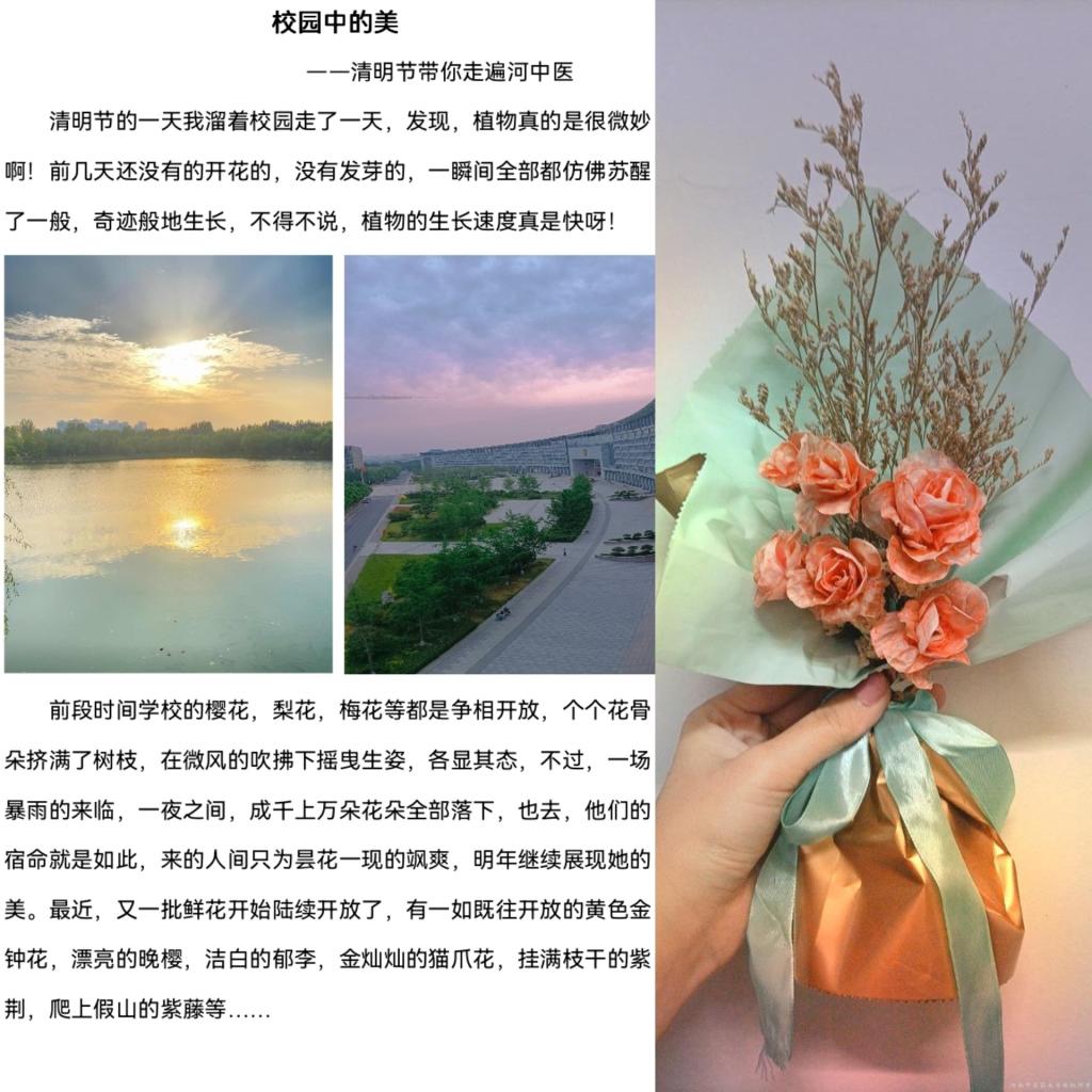 此次活动征集内容丰富,形式多样,设计精美,主要包括文章和艺术加工品。在众多投稿作品中叶晶蕊同学的手工作品—“柚子皮玫瑰花”脱颖而出,获得一等奖,叶晶蕊同学选择了平常的柚子皮,变废为宝做成了玫瑰花。随意的裁剪加上简单的组装,一束带有芬芳气息的特殊玫瑰花就诞生了。征文以“校园中的美”为题,配以生机盎然的图片讲述了漫步校园所发现的宝藏美景,让同学们主动去发现校园的美,增强了同学们的爱校荣院的意识。