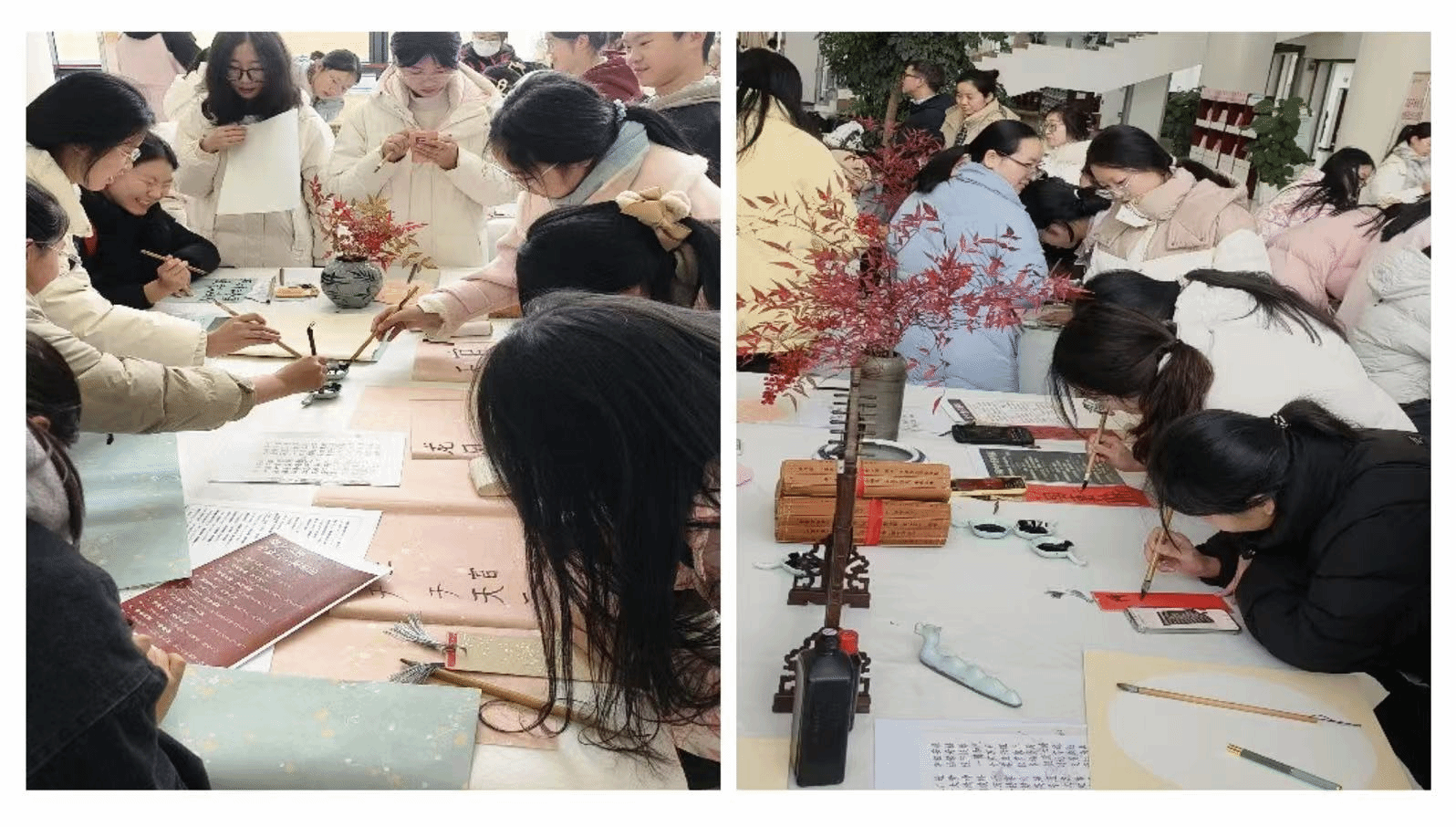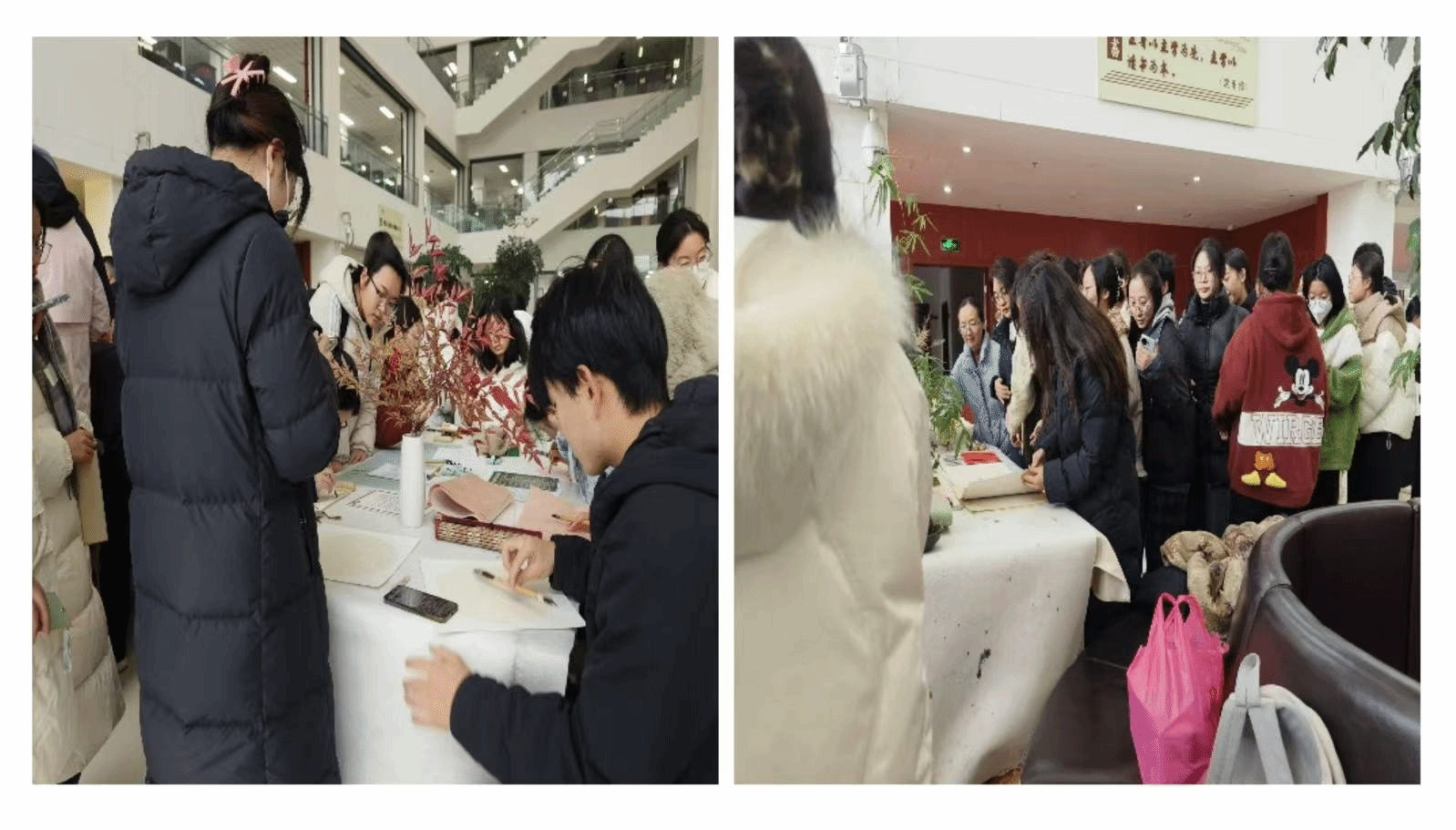 大学生书画协会与图书馆书友会于图书馆二楼大厅联合举办“书书联动——当颜如玉遇见兰亭序”阅书籍、写书法活动,本次活动共吸引100名同学参加。