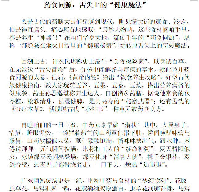 以笔为舟,以文为桥。同学们以药食同源为引,围绕中药养生的历史与现代生活,构建起一片交流的心灵港湾,大家齐聚一堂,分享个人在养生道路上的点滴感悟与独特心得。每一篇作品都触动着读者的心弦,引据经典的同时,又不乏趣味,引人入胜。其中,2023级中药学本科班杨深琪的作品更是让人眼前一亮,作者独辟蹊径,深入且精妙的阐述了药食同源的核心理念,从《黄帝内经》的智慧箴言到历代新葡京娱乐城典籍的详实记载,梳理出药食同源理论的发展脉络,让读者仿佛踏上了一场穿越时空的中医药文化溯源之旅。