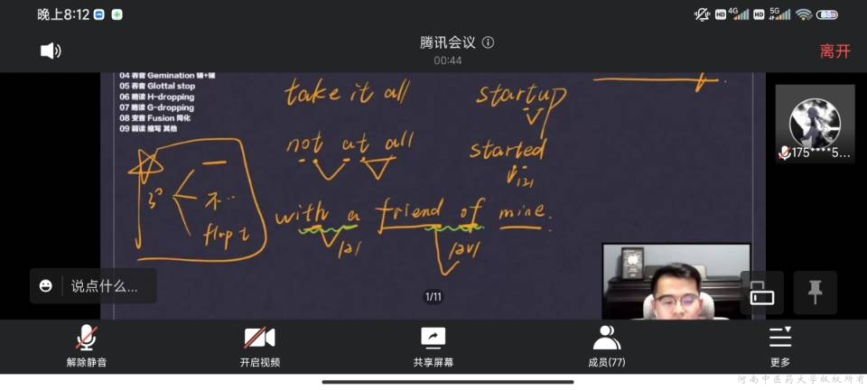 活动开始,同学们通过观看教学视频,学习视频中老师的发音规则和技巧,对连读、浊化两个基本的发音进行学习并加以比较和模仿,通过对“talk it all”“not at all””with a friend of mine”等常用短语的跟读、练习,逐渐掌握基本口型、舌位和发音技巧。参与成员经过充分的模仿练习准备,以清晰的音准、流畅的语言展示了自己的风采。最后,教学成员进行发音纠正,根据同学们发音中存在的问题提出针对性的指导。其中,杨永炎、王晨钰等同学表现积极,主动分享自己的学习经验和学习资料,活动氛围融洽,成员收获颇多。