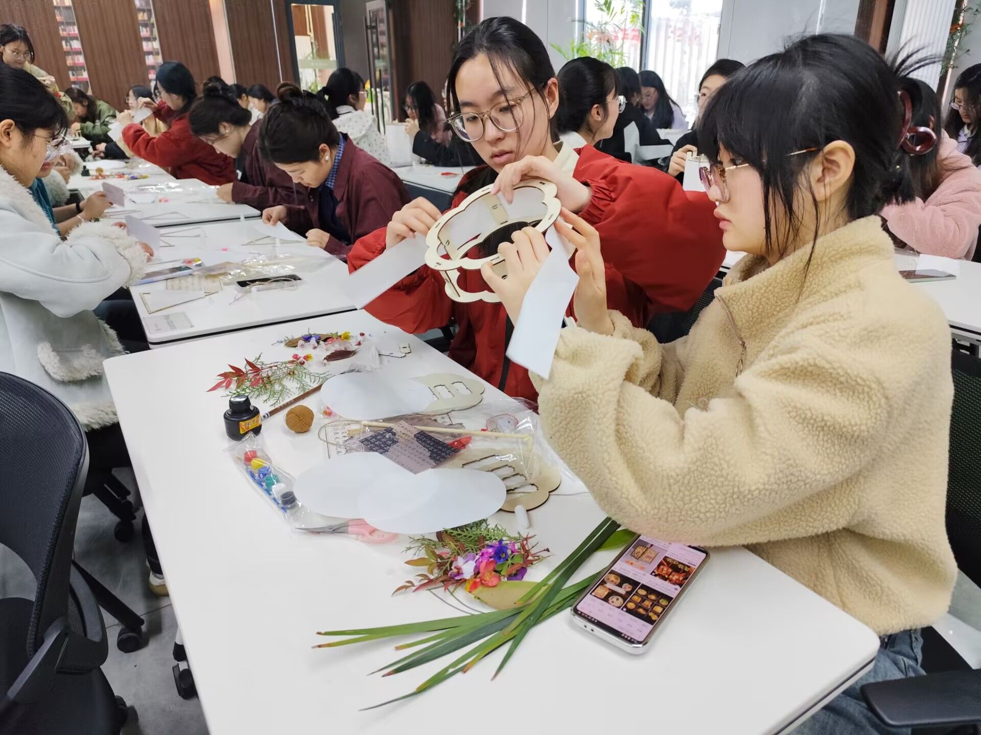 活动开始向同学们介绍了花灯背后的文化故事,春分时节的花灯,寓意着光明与希望,象征着人们对自然规律的敬畏与对和谐生活的追求。同学们用心选择材料,从灯架的构建、宣纸的粘贴、书法的撰写,再到后来依照自己的创意与审美,将在校园中收集到的花朵和小草装饰在花灯上,一步步体验古法花灯的制作过程。一盏盏以春分节气为主题的花灯逐渐成型,有的描绘了燕子归来、春花绽放的春日盛景,有的则以阴阳平衡为灵感,展现了春分节气的文化内涵。学生们在制作过程中不仅锻炼了动手能力,更深刻体会到了传统手工艺的精妙与匠心。