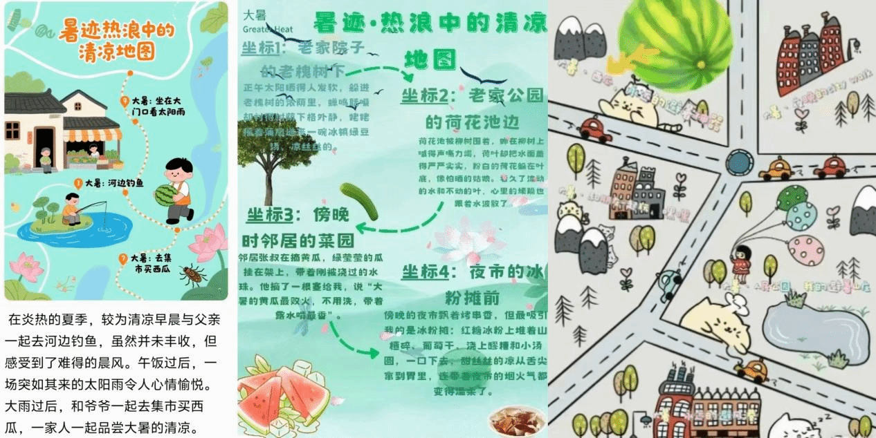 脚步丈量盛夏,地图串联清凉。活动鼓励参与者以手绘、电子地图或在线工具绘制个人暑期足迹图,同学们在关键坐标标注与大暑节气深度关联的自然印记、习俗体验与心灵共鸣。既有记录骄阳炙烤下生命张力的自然淬炼——蝉声如沸的林荫道、雷雨骤降的广场、荷香漫溢的湖畔;亦包含延续千年消暑哲学的智慧传承——外婆递来的绿豆汤、菜场采购的冬瓜、火锅店“以热制热”的贴伏膘;更不乏于喧嚣中安顿身心的心灵栖居——图书馆避暑静读、稻田蛙鸣伴晚风、泳池边的冰西瓜派对。创作过程以创育心,激发参与者重新发现生活细节中的节气意蕴,在压力释放与自我调适中实现心灵疗愈;一份份地图承载个体与节气的同频共振,让行走轨迹化作“心静自然凉”的消暑良方。本次活动以创新形式唤醒学子对节气文化的深度共情,通过电子地图的科技感与手绘稿的温度感交融,彰显传统智慧在当代青年中的鲜活传承。在热浪中编织出兼具地理坐标与情感温度的清凉记忆,为盛夏心灵注入宁静力量。