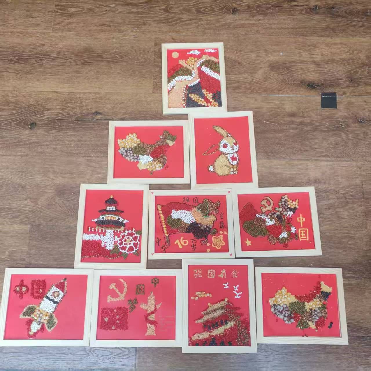 活动中,同学们热情高涨、积极参与,充分发挥想象力与创造力,运用多样的五谷材料,以匠心巧思绘就红色主题画卷。他们以五谷为笔、以草木为墨,将传统与创新融为一体,生动诠释了青年学子对党和祖国的真挚热爱。作品中,有以中国地图为背景、用五谷描绘锦绣河山的宏大构图,也有以标志性建筑为主线、展现祖国繁荣昌盛的细腻画面。其中,乔兵霞、吉欣华小组的作品构图精巧、色彩鲜明,以五谷粒粒铺就巍峨长城,寓意民族精神坚韧不屈,荣获本次活动一等奖。