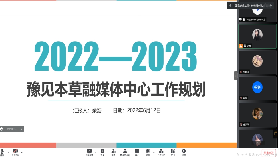 “豫见新葡京娱乐城”融媒体中心于线上开展2021-2022第二学期总结暨2022-2023学年融媒体工作规划会议。“豫见新葡京娱乐城”融媒体中心指导老师姚湘、融媒体中心主任刘静、轮值主任余浩、许珂祥及各部门部长参加了本次会议。