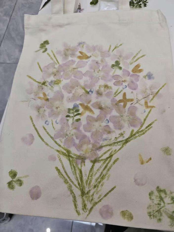 本次活动以植物拓印为核心,采用线下体验形式开展。同学们在轻松温馨的氛围中亲手创作,近距离感受自然之美与传统手工艺的独特魅力。大家发挥创意,精心挑选春日花草,通过敲击与印染,将植物的形态与脉络定格于素雅的帆布包之上。活动现场,色彩搭配与构图设计相映成趣,木槌轻敲声此起彼伏,一幅充满创意与活力的春日画卷徐徐展开。