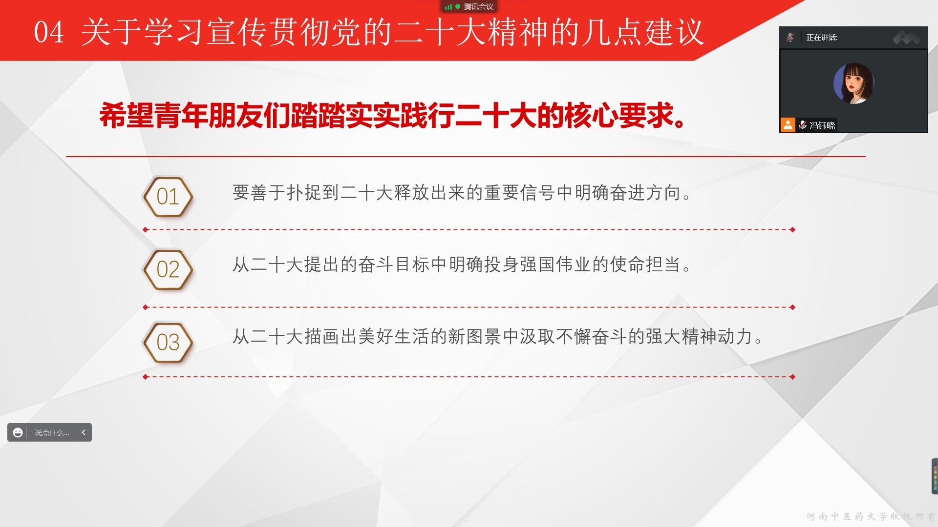青年团员坚持用党的先进思想理论武装头脑,也指引同学们听党话、跟党走,勇担时代责任使命,用实干担当为全面建设社会主义现代化国家贡献力量。
