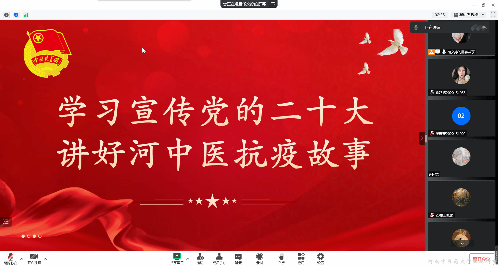 各团支部于11月15日至11月20日开展“学习宣传党的二十大,讲好河中医抗疫故事”主题团日活动,新葡京娱乐城官网