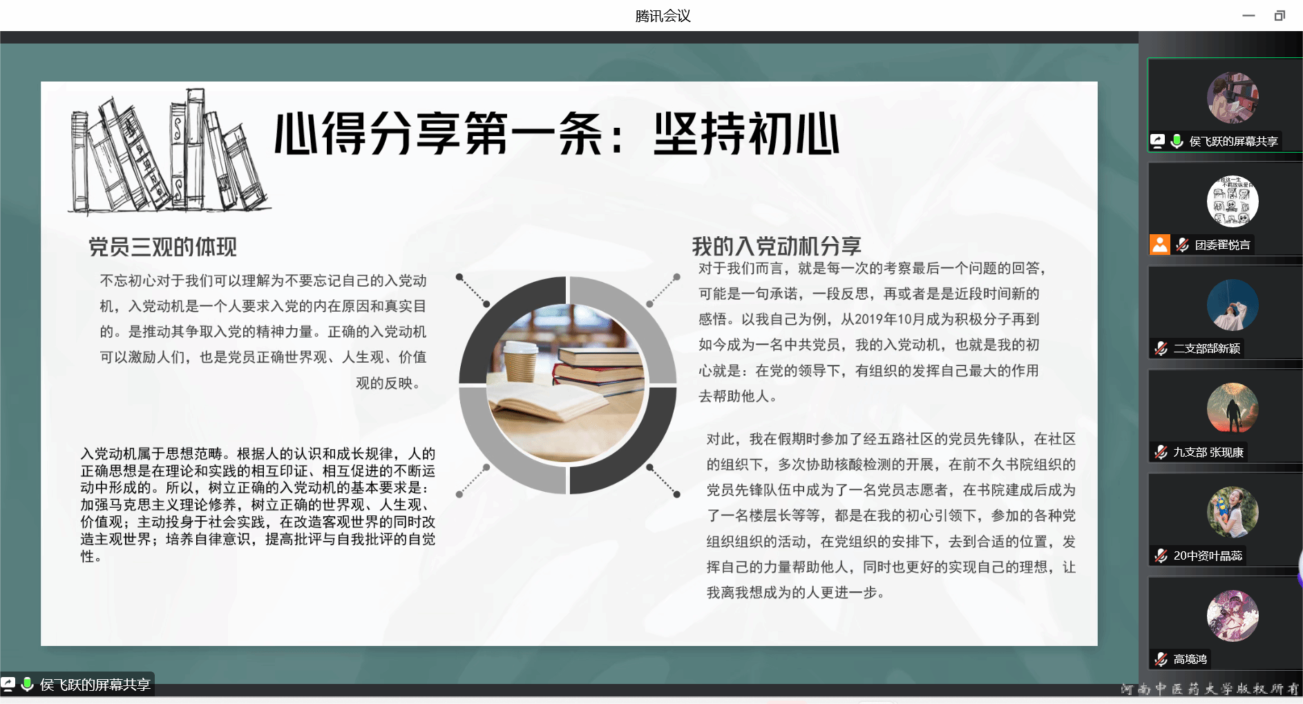 学生党员中优选了两名在思想、学生、志愿服务、社会实践中表现非常优异的同学分享自己的大学成长历程。2019级中药学本科班侯飞跃同学从建立目标、制定计划和实施方案等方面激励同学们要树立计划意识,保持努力向上的学习和生活态度,同时结合当下时政,认真学习贯彻落实党的二十大精神,用敢干实干为强国事业添砖加瓦。2020级中药资源与开发本科班叶晶蕊同学立足于大学的身份转变,结合中药资源普查的社会实践,与同学们分享理论与实践相结合的重要性,同时提醒大家要坚定理想信念,听党话、跟党走,不负青春、砥砺奋进,书写多彩生活。分享结束后,同学们积极互动,现场气氛热烈。