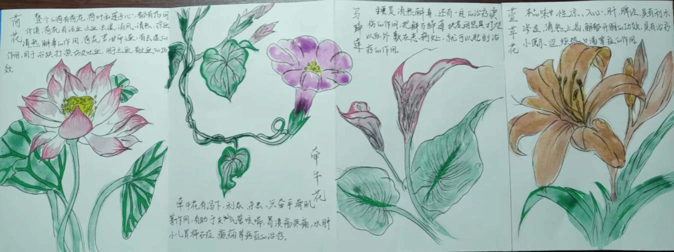 本次的活动以中药的习性和特点为基础,巧妙的将绘画与中药文化结合起来,展现出中国传统文化的魅力。活动中,同学们通过网络资源和书籍报刊查阅资料,去学习了解更多中药文化;通过身体力行,实地观察身边的中草药,为作品绘制做足充分准备。在众多参赛作品中,2022级中药学类一班裴红焱自学创作的《新葡京娱乐城中国》脱颖而出,令人赞叹不已,向同学们生动地展示了荷花、牵牛花、马蹄莲和萱草花的脉络及风貌,再配以清晰文字解说,让同学们了解到这四种中草药习性和功效。