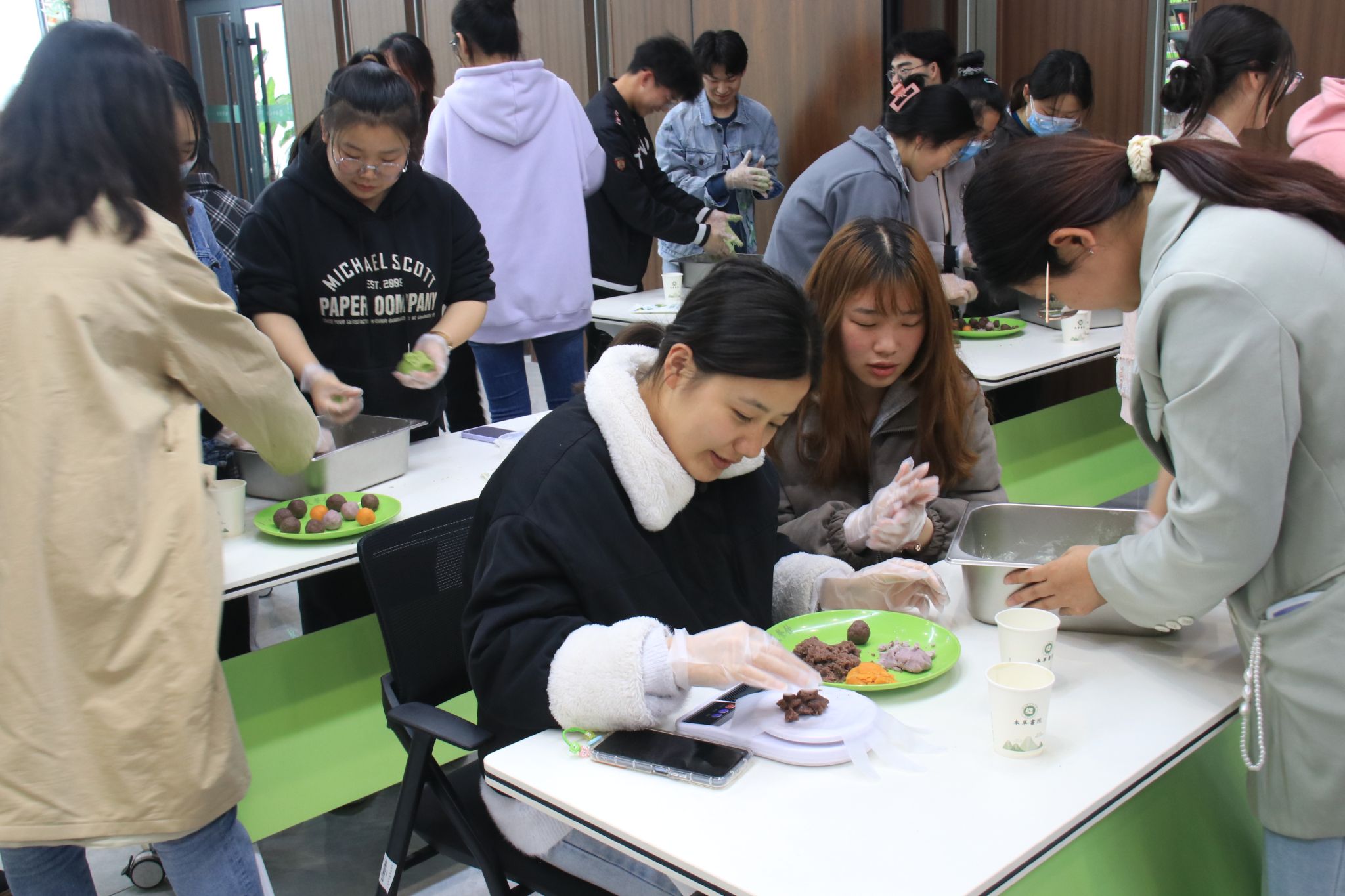 “碧玉团圆满屉香,素舂柔艾捣砧忙。”活动现场,工作人员将准备好的面粉和馅料搬上桌,既有红豆馅的甜口也有蛋黄肉松馅的咸口,满足了同学们的不同需求。各位同学争相尝试,同学们捏取一块拌好的艾草粉糯米团,在手中一搓、一按,艾草的清香和糯米的香甜便从指尖飘散开来,再和入一勺豆沙和肉松,一只圆墩墩、清亮亮的青团就做好了。在制作中,同学们不仅体会到了自己动手的乐趣,更深入地感受到传统文化的美和内涵。活动现场一片其乐融融,洋溢着同学们的欢声笑语。
