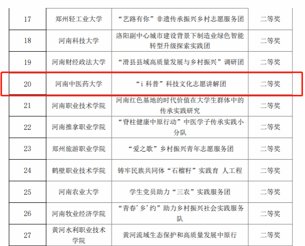 “i科普”科技文化志愿讲解团在第五届河南省普通高等学校“出彩中原”大学生社会实践活动一般项目中喜获二等奖。