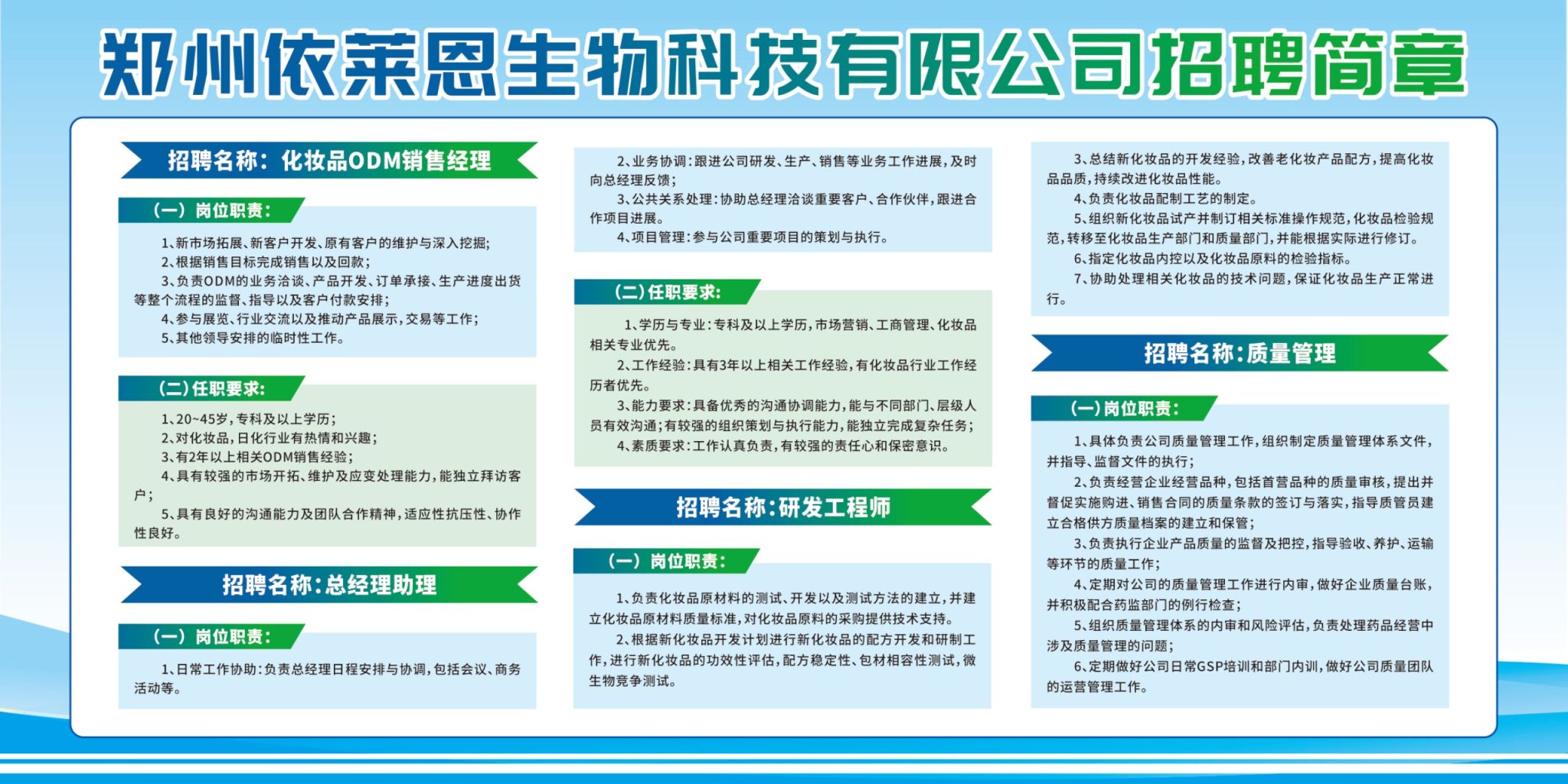 郑州依莱恩生物科技有限公司招聘简章
