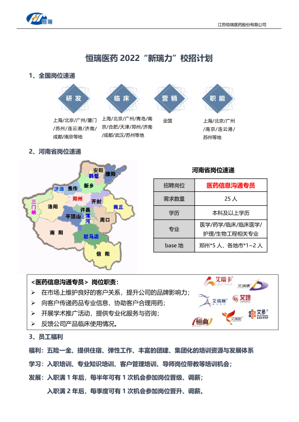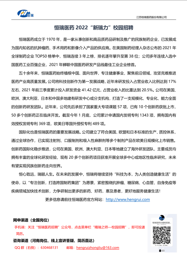 【招聘】恒瑞医药2022“新瑞力”校园招聘简章