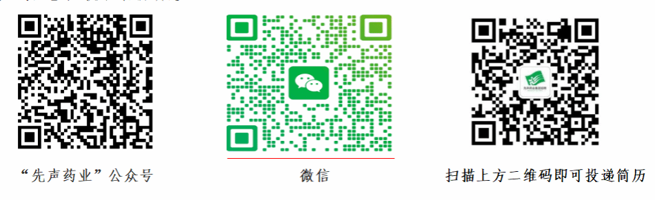 2. 招聘公众号:扫码关注【先声药业集团招聘】(选择“校园招聘”栏目进行投递)、【先声药业】,获取最新动态