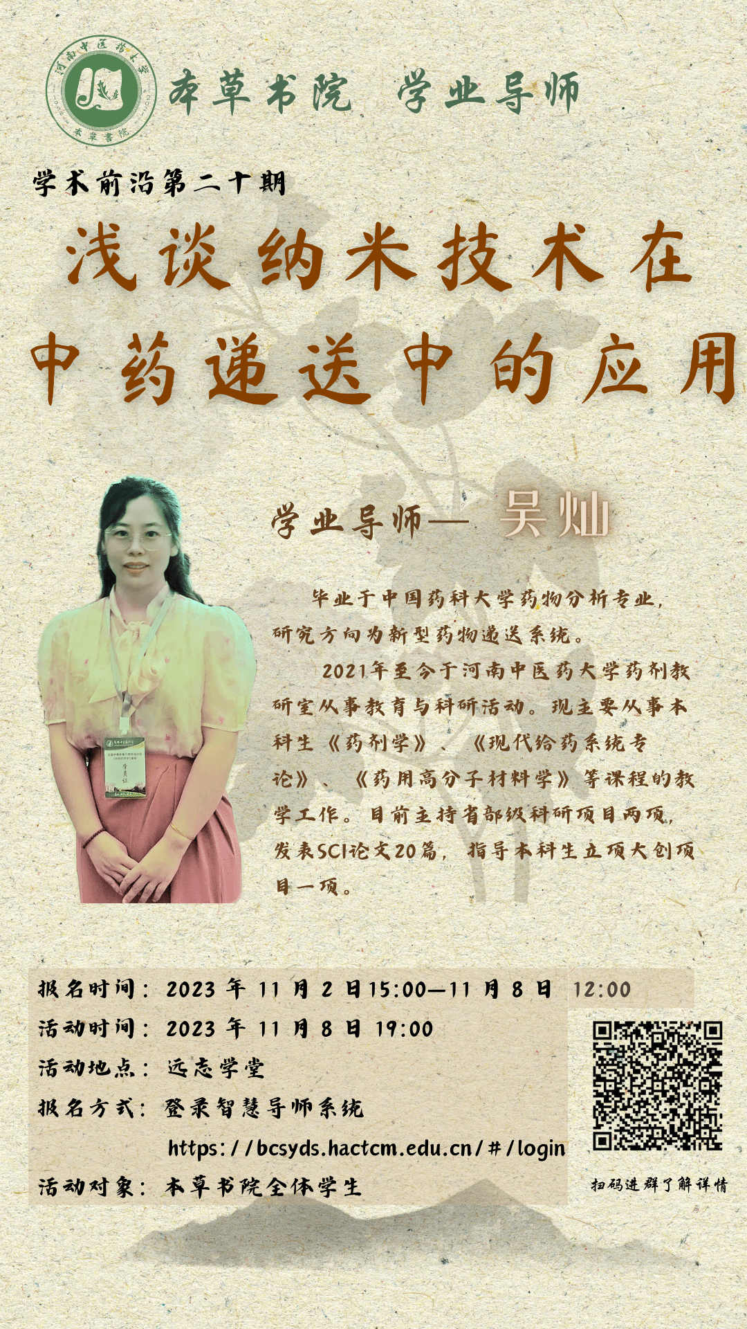 本期活动旨在向同学们科普纳米技术应用于中药递送中的相关研究成果,促进同学们了解药物制剂专业的前沿动态,拓宽同学们的知识视野,帮助同学们明确未来的专业选择与研究方向。