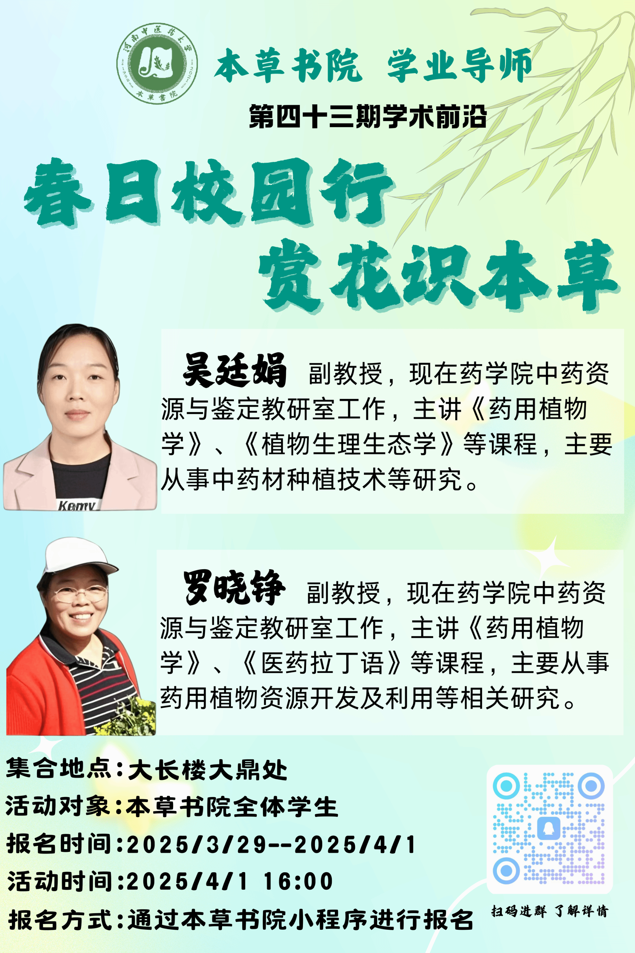 本次活动旨在让学生走出教室,将中药学课堂知识与实地观察紧密结合,直观认识药用植物的形态与特征,深化对知识的理解。帮助学生掌握药用植物识别技巧,培养他们的观察、思考以及实践操作能力。帮助学生从繁重课业中解脱,在春日漫步中放松身心,为不同年级、专业学生搭建交流平台,通过踏春的形式结识新朋友,拓展人际网络。