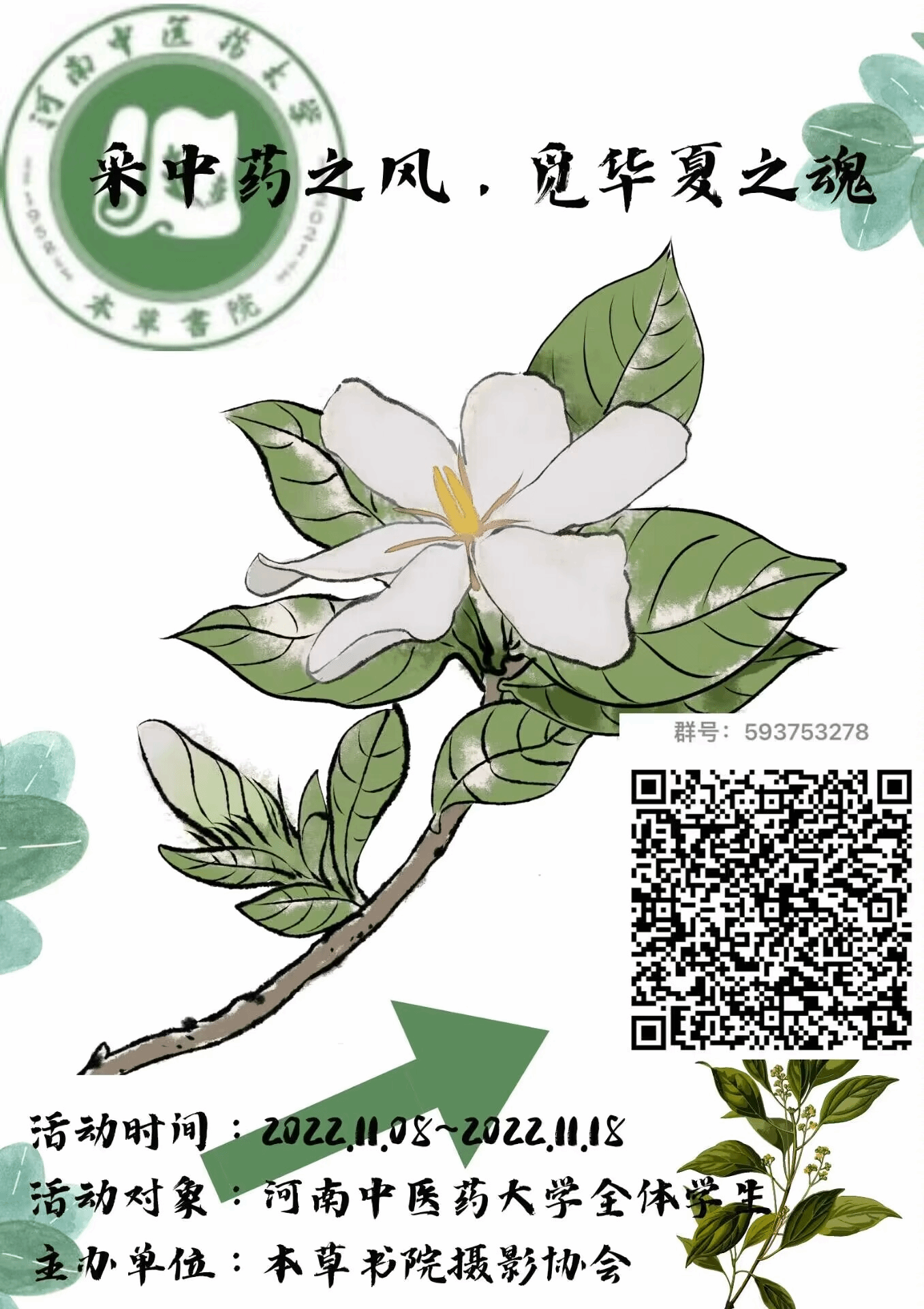 为了让同学们更深入了解中医药的传统文化,同时鼓励同学们在课余时间走出宿舍去发现生活中的小美好,摄影协会特此举行“采中药之风,觅华夏之魂”主题摄影大赛,让同学们晒出自己与中药草的合影,以此增长自己对中药草方面的知识。
