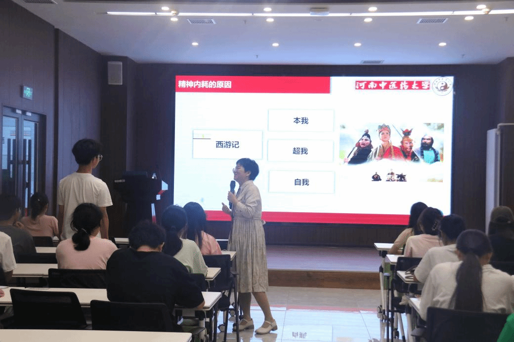 在学习生活中,同学们常常面对着各种选择,容易陷入自我内耗的纠结陷阱,弓建红结合精神分析学家弗洛伊德“本我、自我与超我”的相关概念,深入剖析现代大学生普遍存在的自我内耗现象。随后,弓建红借用一个个鲜活生动的故事,详细分析同学们产生精神内耗的原因,并提出两方面解决自我内耗的方法:一是当面临太多选择时,要减少自己做选择的机会,提高专注力;二是当陷入自我能力怀疑时,不纠结当下,增强行动力。讲座最后,弓建红对同学们提出的问题进行全面解答。讲座现场,气氛活跃,互动频频。