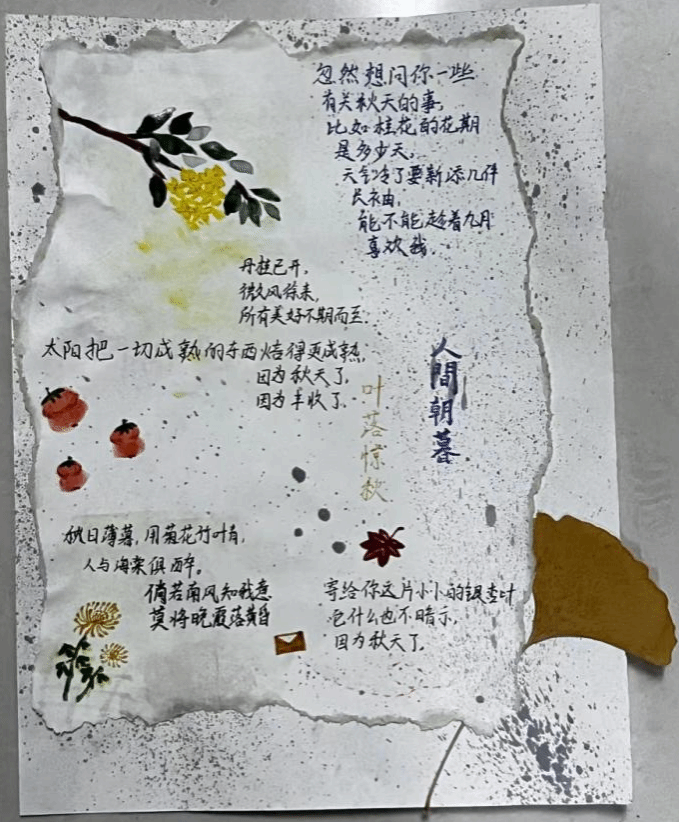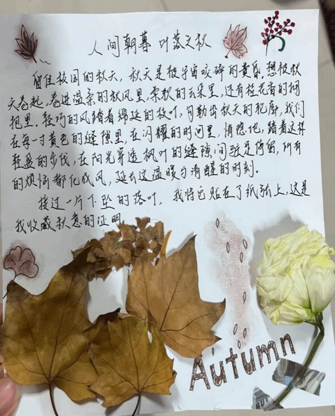活动期间,同学们把自己的所见所闻、生活趣事和学习日程等作为素材,用绘画定格生活中的精彩瞬间,用文字传递生活中的烟火气。2023级中药学类一班申惠汝同学用精巧的手工艺进行点染绘画,使秋天的美妙跃然纸上;2023级中药学类一班刘超冉同学用优美的文字和秋日的落叶精心装点作品,记录了秋天的美好瞬间。每一幅手账都展现出同学们对青春的热爱,对美好生活的渴望与追求。