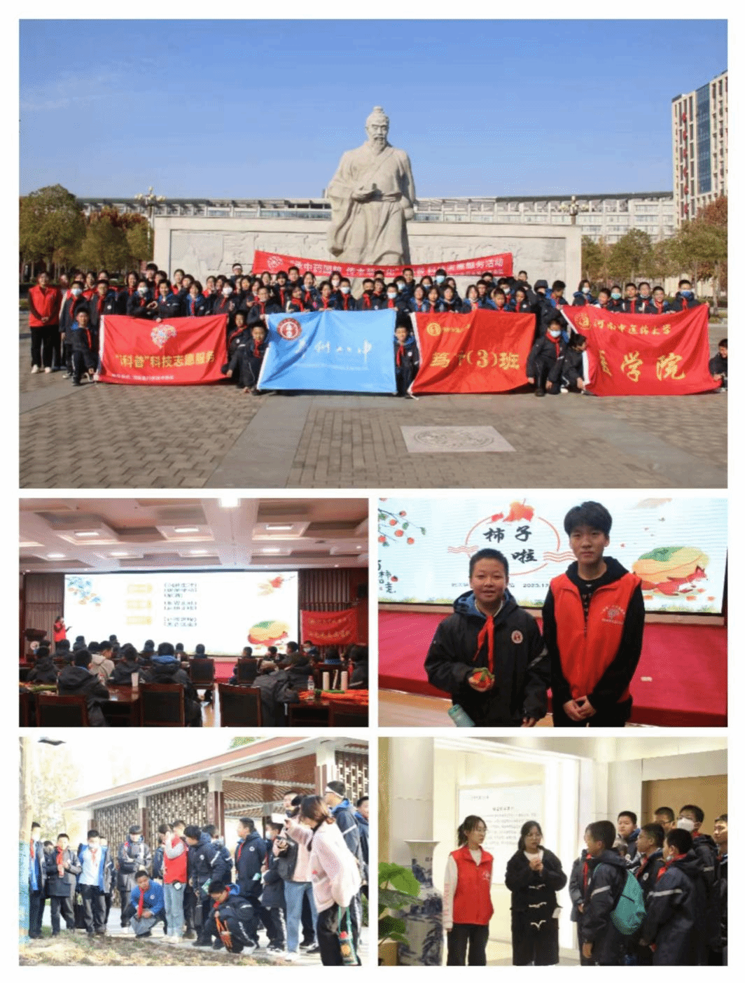 本次活动围绕医史馆讲解、中药馆解密、药植园参观、人体科学馆和中药趣味课堂五个方面有序展开。在医史馆讲解中,志愿者带领同学们参观序厅、河南历代医史展和河南中医药文化遗迹展三个主要展区,向学生们详细讲述河南中医药发展历史;在中药馆解密中,志愿者向学生们讲解各类标本,使他们直观了解中医药;在药植园参观中,同学们近身接触了解中药植物形态特征,生活特性等知识;在人体科学馆中,志愿者带领同学们参观展品,了解有关人体形态结构的相关知识;在中药趣味课堂中,同学们学习了中药“柿子”的药性药效和在生活中的运用,并在志愿者的指导下模拟中草药的性状进行了形式多样的手工艺品制作,激发了同学们学习中医药文化的浓厚兴趣,活动现场气氛热闹有趣。